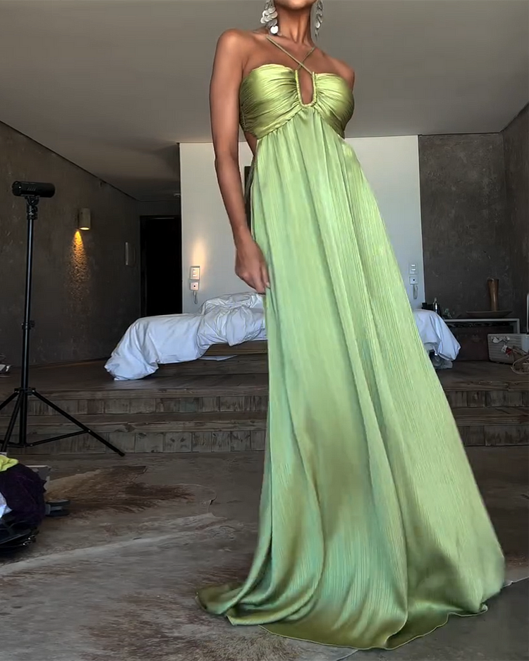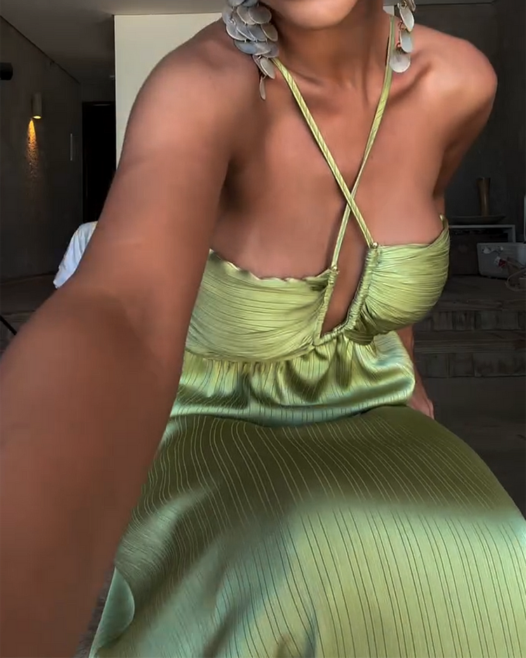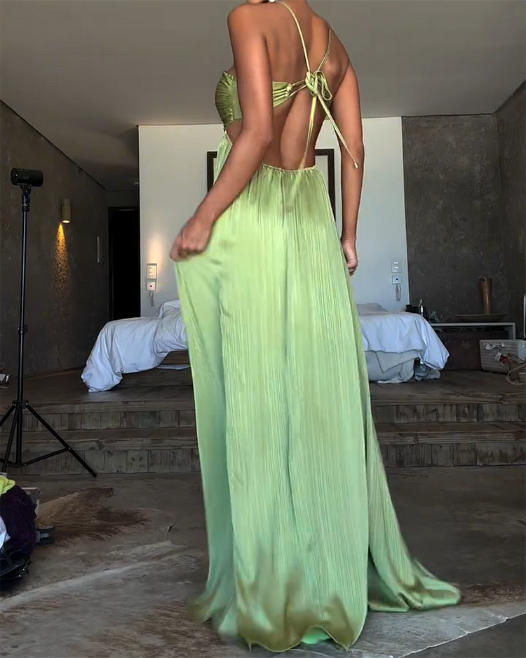 Perfect for summer parties, evening dinners, or destination getaways, the design balances feminine detail with modern appeal. The pleats add volume and texture, while the open-back cross strap detail gives a touch of drama to the minimalist silhouette.
